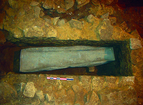 Une phase d’occupation mal circonscrite, comprise entre la fin du XVe siècle et le XIXe siècle, est matérialisée par cinq sépultures, une fosse et un niveau d’occupation. La première sépulture est un sarcophage de plomb installé dans le caveau (fig. 13). Un terminus post quem a pu être déterminé grâce à une monnaie collectée au sein de la couche de remplissage supérieure de la tombe livrant la date de 1642. Le caveau n’a par la suite plus été utilisé. Ce sarcophage n’a pas été fouillé par décision du SRA qui a préconisé des mesures de sauvegarde afin de le laisser en place tout en assurant sa protection au cours des travaux prévus. Une sépulture d’immature est installée au sein d’un mur arasé de la chapelle primitive. Si ces deux sépultures sont clairement postérieures à la reconstruction de la chapelle, tel n’est pas le cas pour les trois autres, qui pourraient très bien être antérieures, deux d’entre elles étant toutefois postérieures à l’abandon du caveau primitif. Néanmoins, en l’absence de tout indice probant, elles sont considérées comme tardives. Une probable sépulture d’immature a pu être disposée au sein du caveau encore en usage. Les deux dernières sépultures se succèdent quasiment au même emplacement, à l’aplomb du caveau abandonné, la première étant très lacunaire. Une fosse pour laquelle aucune interprétation assurée ne peut être proposée a été ménagée à l’aplomb du caveau. On peut éventuellement penser à un repentir lors du creusement d’une fosse sépulcrale. Enfin, un mince niveau d’occupation surmontant le sol empierré matérialise la fin de l’occupation de ce sol avant son remplacement par le dallage actuel.