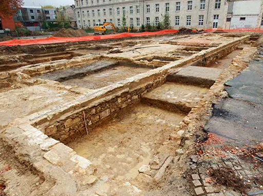 La fouille préventive réalisée sur le site après destruction des bâtiments a permis d’ouvrir, dans des espaces exempts d’une trop grande densité de vestiges modernes, des fenêtres d’étendues et de profondeurs variables jusqu’aux niveaux antiques (fig. 1). Si du mobilier antique résiduel en est sorti, ces investigations n’ont malheureusement pas permis de trouver des structures à proprement parler.
