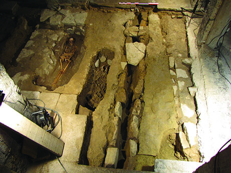 Une sépulture a été mise au jour dans le collatéral nord. Le squelette, en apparence complet, est néanmoins très perturbé (fig. 3). Le remplissage de la fosse contient un mobilier céramique datable du Moyen Âge central.