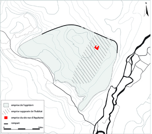 La fouille menée rue d’Aquitaine à la fin de l’année 2013 est la première opération d’archéologie préventive sur le secteur de l’habitat de l’oppidum. L’objectif scientifique principal était de caractériser le type d’occupation par l’étude des structures et du mobilier, puis de la replacer dans le contexte local et régional.